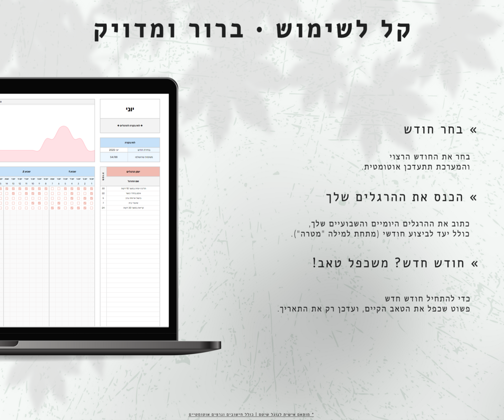 - מעקב עד 30 הרגלים חודשיים (יומיים/שבועיים)