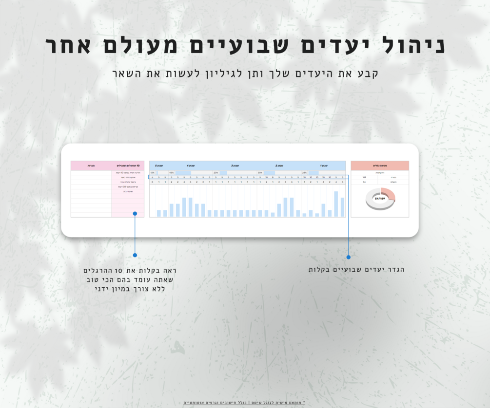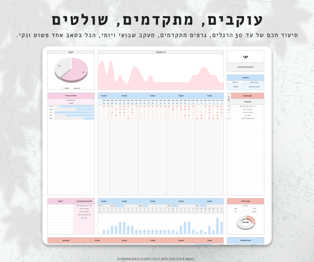 גיליון גוגל שיטס מעוצב למעקב יומי ושבועי אחרי הרגלים אישיים – כולל גרפים אוטומטיים, ניתוחים חכמים, טבלת TOP 10, תכנון שבועי ועוד.